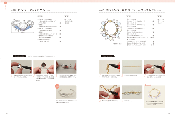 たしかに、アクセサリーづくりの基礎知識からつくり方まで、初心者にもわかりやすく紹介されている。バングルに接着剤でパールをつけるだけのワンステップで完成するものなどは私でもできそうな・・・。なかには、懐かしのプラバンを使ったアクセサリーも!好みのパーツを組み合わせてつくれば、とっておきのオリジナルアイテムができ上がる。