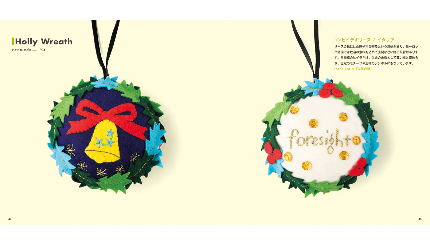 フェルトの質感を生かしたフォルムに、流行の刺繍をほどこしてあり、懐かしさの中にも新しさを感じる作品に仕上がっています。色使いは東欧や北欧などのイメージを彷彿とさせ、手軽に作れてプレゼントにも喜ばれる、かわいい大人女子のチャームです。