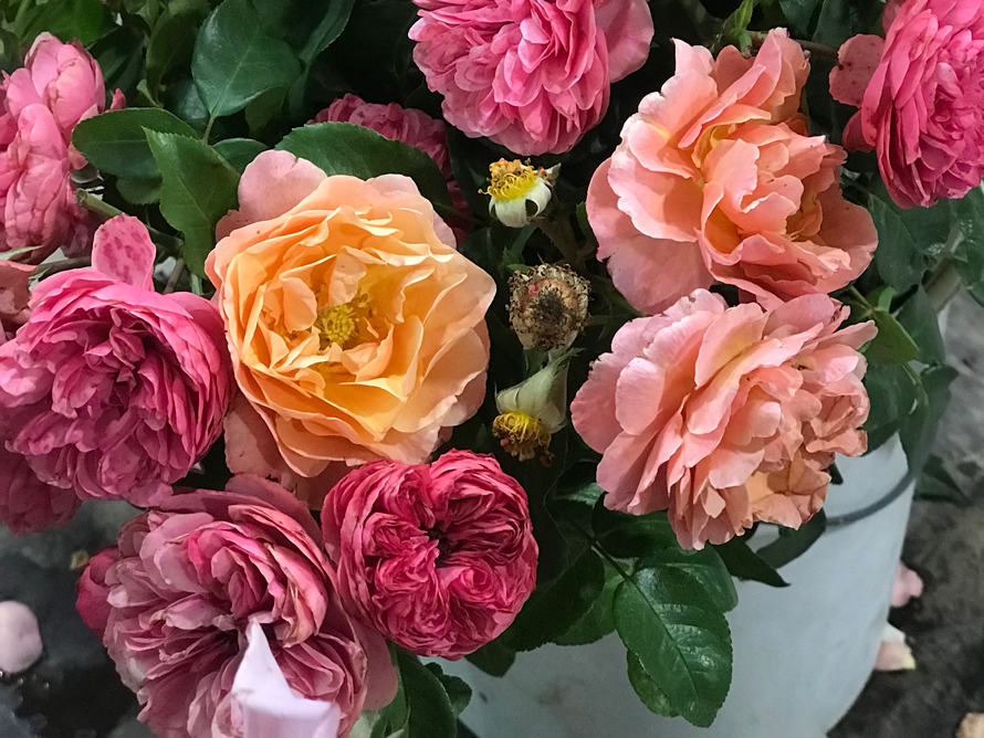 私がパリに花の勉強に来て、最も大きく変わったことは「きれいに咲きそろった花を使って丸や三角など、幾何学体を作る」ことから「自然の風景を再現し、室内に取り込んで愉しむ」という視点になったことです。ランジス花市場でも、ハウスで育てた規格品のバラより、生産者さんのスタンドに並ぶ1本ずつ咲き姿の異なる個性派が気になります。
