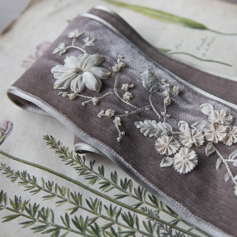 18世紀ごろのヨーロッパで生まれ、 貴族の衣装や身のまわりの装飾品に使われていたリボン刺繡。きらびやかなイメージをもっている人も多いと思いますが、実際のリボン刺繡は素材によって、華やかにも清楚にもなる、とても多彩な刺繡です。