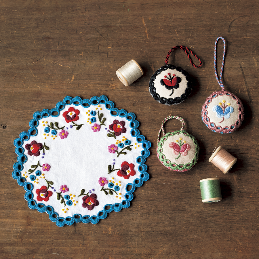 アイレットエッジが華やかなドイリーとオーナメント。オーナメントはバッグチャームとしても。可憐な小さなバラもさまざまな色で楽しんで。
