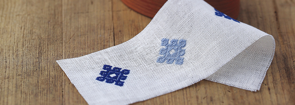 こぎん刺しは、青森県弘前市を中心とする津軽地方で江戸時代に生まれました。冬の寒さをしのぐため、補強と保温を兼ねて目の粗い麻布に木綿の糸で刺しゅうを施したのが始まりで、野良着を意味する「小巾」や「小衣」(ともに読みは「こぎん」)に由来します。