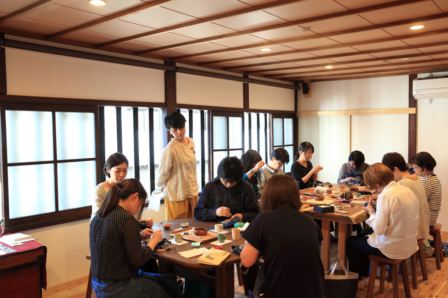 レッスンの終わりに、ワークショップに参加された皆さんで記念撮影をしました。充実したものづくりの時間だったことが伝わってくるような、素敵な笑顔が溢れています。前列中央には、どこにもないトートバッグをつくり出した笑顔のatsumiさん。その左右には、この日のために裏方として頑張って来た5代目女将の今井登美子さんと、6代目を担う息子の春樹さんも一緒です。