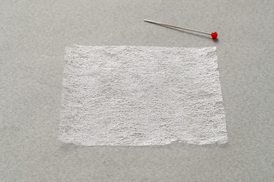 ▲剥離紙つきの樹脂シートをアイロンで布に貼り、剥離紙を真ん中から針で破く。