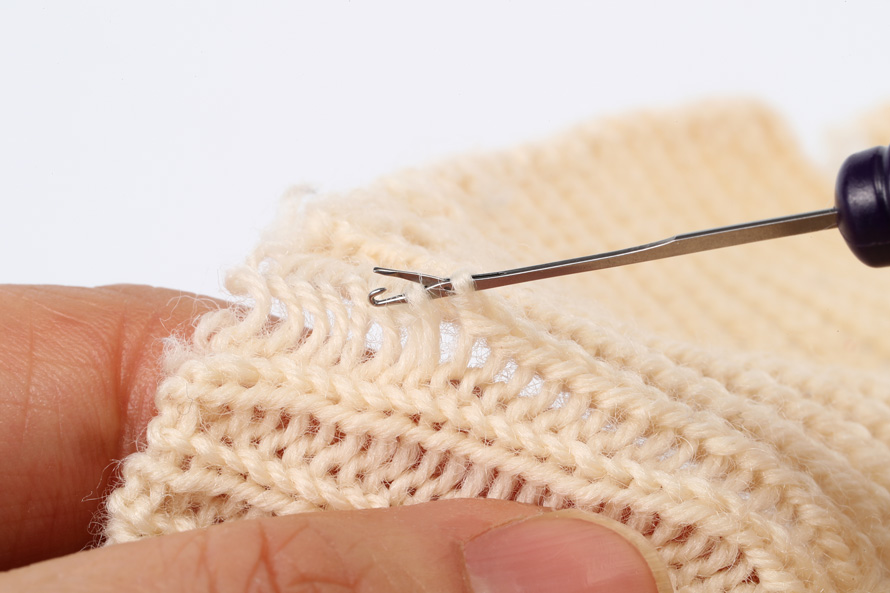 縦方向にほつれてしまった場合は、「タッピ」や「ベラ針」といった昔からある道具で、一目ずつ編み直していくことができます。これは編み機で編み地をつくる際の針と同じ構造で、編み地の糸に適したサイズのベラ針があるとスムーズに直すことができます。