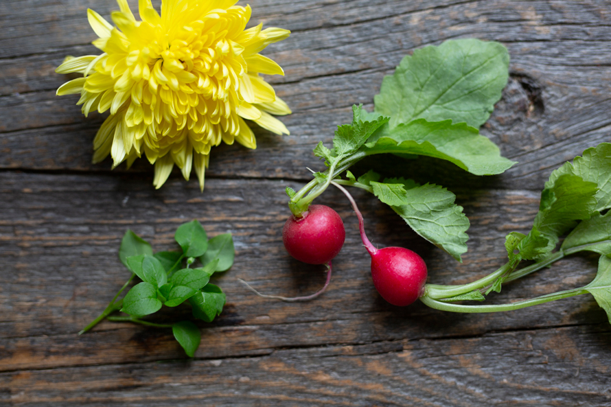お好みで、菊の花びら、はこべ、ラディッシュの薄切り(分量外)を添える。